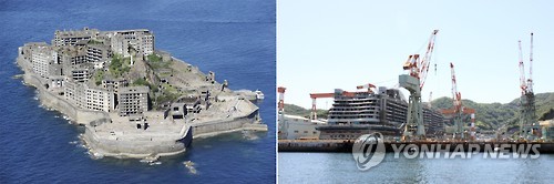 | △ 조선인 강제노동 현장인 하시마(端島, 일명 '군함도'.왼쪽) 탄광과 나가사키 조선소의 대형 크레인 (연합뉴스 자료사진) |