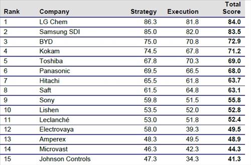 이어 파나소닉 69점, 히타치 63.7점, 영국의 Saft 63.1점, 소니 55.8점, 중국의 Lishen 52.8점 등이 10위권 내에 위치했다.