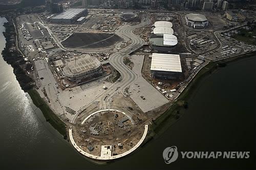 | △ (리우데자네이루 EPA=연합뉴스) 지난달 22일(현지시간) 브라질 리우데자네이루 상공에서 내려다 본 2016년 리우 하계올림픽 주요시설인 올림픽 파크의 건설 현장 모습. 2010596@yna.co.kr |