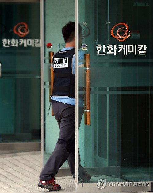 | △ 경찰, 폭발사고 낸 한화케미칼 울산공장 압수수색 (울산=연합뉴스) 김용태 기자 = 울산 남부경찰서는 폐수처리장 저장조 폭발로 협력업체 근로자 6명이 숨지는 사고가 발생한 한화케미칼 울산2공장에 대해 4일 압수수색을 실시했다. 이날 경찰 관계자가 압수수색 대상이 된 한화케미칼 환경안전팀 사무실로 들어가고 있다. 2015.7.4 yongtae@yna.co.kr |
