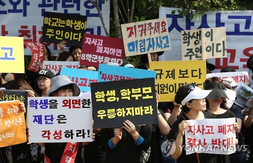 자사고 학부모들은 교육청 앞에서 집회를 열고 "자사고 죽이기 정책을 절대 받아들일 수 없다"며 반발했다.