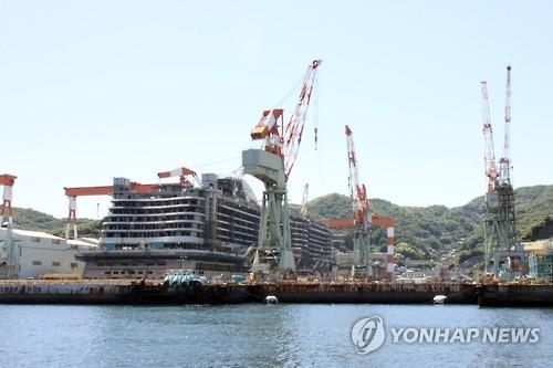| △ 일본 나가사키(長崎)시 소재 미쓰비시(三菱)중공업 나가사키 조선소에서 대형 크루즈가 건조 중이다. |