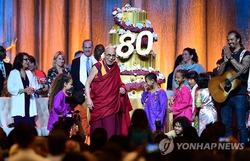 (애너하임<미 캘리포니아 주> AFP=연합뉴스) 티베트의 정신적 지도자 달라이 라마의 80번째 생일을 축하는 행사에 동료 노벨 평화상 수상자들이 참석해 축하 인사를 건넸다.