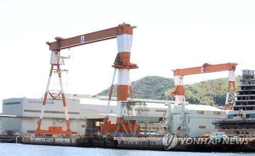 | △ 2015년 6월 4일 일본 나가사키(長崎)시 소재 미쓰비시(三菱)중공업 나가사키 조선소에서 대형 크루즈가 건조 중인 모습이 보인다. |