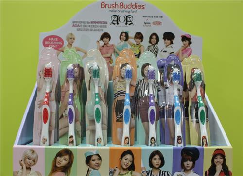 미국의 칫솔 회사 '브러시버디즈'의 상품으로 월드스타 싸이와 걸그룹 AOA의 이미지가 담겨 있다.