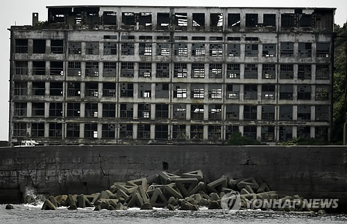 | △ 日 메이지시대 23개 산업시설 '세계유산' (AP=연합뉴스) 유네스코 세계유산위원회는 일본 정부가 미쓰비시 조선소를 포함, 규수(九州)와 야마구치(山口) 지역 중심 근대화 산업시설 23곳을 하나로 묶어 등재 신청한 산업유산 시설들을 'Sites of Japan's Meiji Industrial Revolution: Iron and Steel, Shipbuilding and Coal Mining'(일본 메이지 산업혁명: 철강, 조선 그리고 탄광산업)이라는 이름으로 5일(현지시간) 세계유산에 등재했다. 이날 등재된 산업유산 23곳 중 7개소는 태평양전쟁 중에 조선인이 대규모로 강제동원돼 노동에 혹사된 곳. 사진은 세계유산에 등재된 나가사키 근해 하시마섬(일명 군함섬) 탄광의 주거로 쓰인 건물의 잔해. |