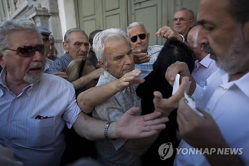 | △ (아테네 AP=연합뉴스) 그리스가 전날 채권단의 구제금융안에 대한 국민투표에서 '반대'를 선택한 가운데 6일(현지시간) 아테네의 한 은행에서 직원이 몰려든 노인들에게 연금 지급에 앞서 번호표를 나눠주고 있다. 국제채권단과의 협상 실무 총책임자였던 야니스 바루파키스 그리스 재무장관은 이날 전격적으로 사임 의사를 밝혔다. '비호감 파트너'인 자신이 물러남으로써 채권단에 협상을 압박하기 위한 조치로 풀이된다. bulls@yna.co.kr (끝) |