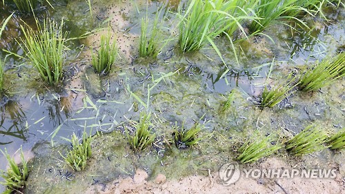 (고창=연합뉴스) 전북 고창군 흥덕면의 한 논에 7일 멸강충이 출현해 벼 줄기와 논바닥을 새까맣게 뒤덮고 있다.