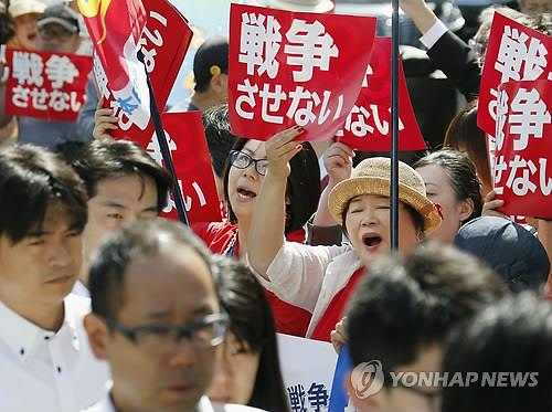 | △ 2015년 5월 14일 일본 도쿄도(東京都) 지요다(千代田)구 총리관저 인근에서 아베 신조(安倍晋三) 정권의 안보법제 정비에 반대하는 시민들이 시위를 하고 있다.(교도=연합뉴스 자료사진) |