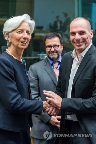 | △ Managing Director of the International Monetary Fund Christine Lagarde, left, greets Greek Finance Minister Yanis Varoufakis during a meeting of eurozone finance ministers in Brussels on Thursday, June 25, 2015. Greece and its creditors launched a new round of talks in Brussels early Thursday in a fresh bid to unlock billions of euros in loans and save the country from bankruptcy. (AP Photo/Geert Vanden Wijngaert) |