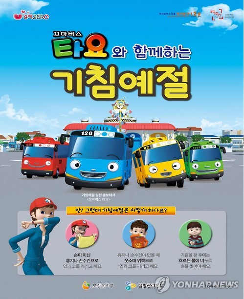 | △ '꼬마버스 타요' 기침 예절 포스터 (서울=연합뉴스) 보건복지부 질병관리본부는 감염병 예방을 위한 올바른 기침 예절 문화가 정착되도록 적극 나서겠다고 8일 밝혔다. 사진은 '꼬마버스 타요' 캐릭터를 활용한 기침예절 포스터. 2015.7.8 << 질병관리본부 제공 >> photo@yna.co.kr |