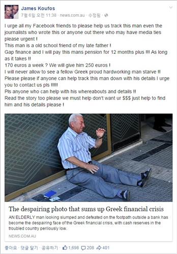 <그리스 위기> 주저앉아 우는 노인 사진에 호주서 날아온 온정