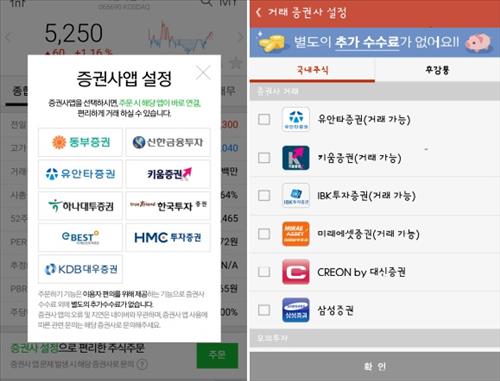 네이버 모바일 증권 페이지에서 원하는 종목의 주문을 클릭하면 유안타증권과 동부증권, 하나대투증권, 한국투자증권, KDB대우증권, 이베스트투자증권, HMC투자증권, 키움증권, 신한금융투자 등을 선택할 수 있는 페이지가 뜬다.