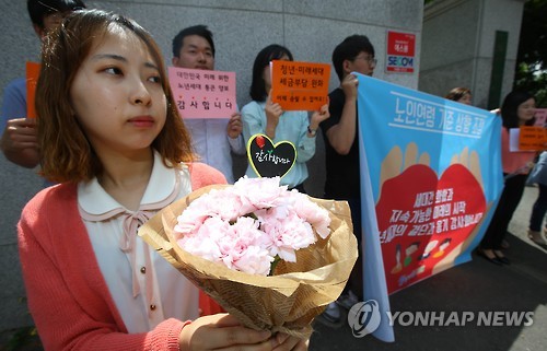 | △ 대한노인회 노인연령 상향 조정 결정에 감사하는 청년 기자회견 (서울=연합뉴스) 김도훈 기자 = 1일 오전 서울 용산구 대한노인회 앞에서 청년이여는미래 회원들이 대한노인회의 노인 연령 법적 기준 상향조정 방안 공론화 결정을 환영하는 기자회견을 하고 있다. 이들은 노령화에 따른 노인 복지 비용 증가와 청년세대의 부담 증가가 커지는 상황에서 노인세대가 먼저 청년·미래세대의 부담을 덜어주기 위해 노력하는 모습에 감사의 뜻을 전한다고 밝혔다. 2015.6.1 superdoo82@yna.co.kr |