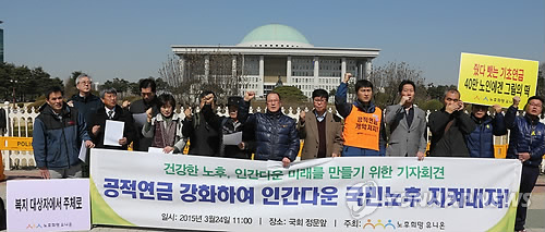 | △ 노후연금 보장 촉구 기자회견 (서울=연합뉴스) 백승렬 기자 = 노후희망유니온 회원들이 24일 국회 정문 앞에서 노후연금 보장을 촉구하는 기자회견을 하고 있다. 2015.3.24 srbaek@yna.co.kr |