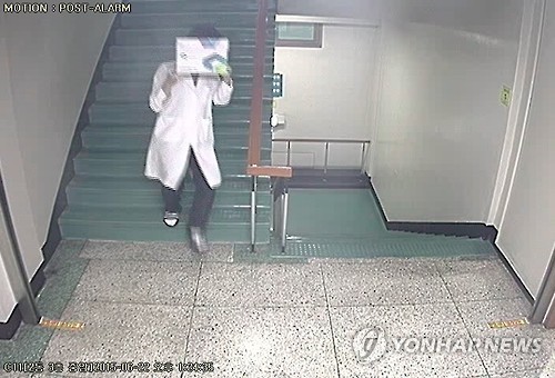 | △ 의사 행세 절도범 (대구=연합뉴스) 대학병원 의사인 것처럼 행세하며 훔친 수표를 사용한 40대가 범행 당시 의사 가운을 입고 빈 상자로 얼굴을 가린 채 모 대학병원 안을 다니는 모습이 폐쇄회로(CC) TV에 찍혔다. 2015.7.9 << 대구지방경찰청 >> mshan@yna.co.kr |