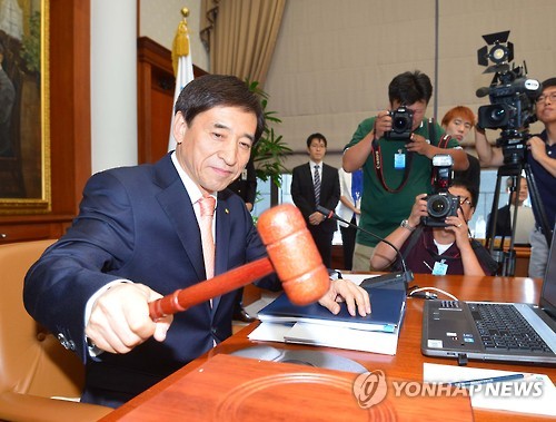 | △ 금융통화위원회 회의 시작 (서울=연합뉴스) 임헌정 기자 = 이주열 한국은행 총재가 9일 오전 서울 중구 남대문로 한은 본관에서 열린 금융통화위원회에서 회의 시작을 알리는 의사봉을 두드리고 있다. |