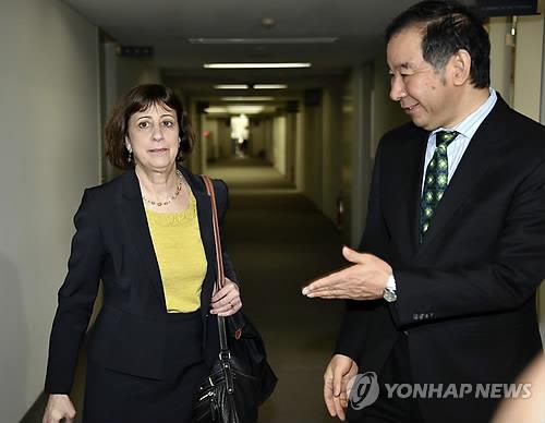 | △ 미국의 웬디 커틀러 미국무역대표부(USTR) 부대표 대행(왼쪽)과 일본 TPP 정부대책본부의 오에 히로시(大江博) 수석 협상관 대리가 작년 10월 도쿄에서 만났을 때 모습. |