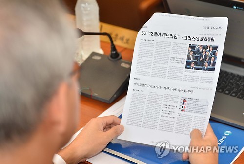 | △ '그리스 사태' 한국 경제에 미칠 영향은 (서울=연합뉴스) 임헌정 기자 = 9일 오전 서울 중구 남대문로 한국은행 본관에서 열린 금융통화위원회에서 한 간부가 그리스 사태 관련 신문 스크랩을 읽고 있다. 2015.7.9 kane@yna.co.kr |
