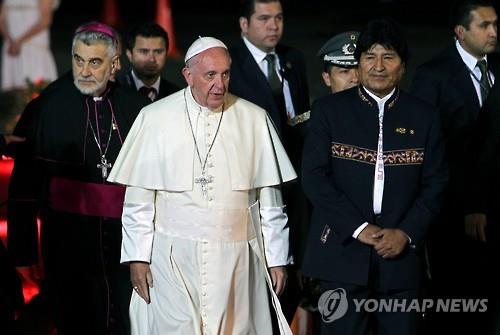 | △ 에보 모랄레스 볼리비아 대통령(오른쪽)이 9일(현지시간) 볼리비아 도시 산타 크루스를 방문한 프란치스코 교황을 영접하고 있다.(EPA=연합뉴스) |