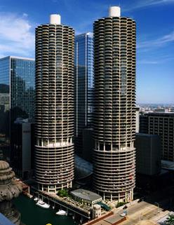 멀리서 보면 거대한 옥수수 속대를 나란히 세워놓은 것 같은 각 65층, 179m 높이의 쌍둥이 주상복합 빌딩 마리나 시티는 1963년 완공 당시 철근 콘크리트로 올린 세계에서 가장 높은 주거용 빌딩이라는 기록을 세웠다.
