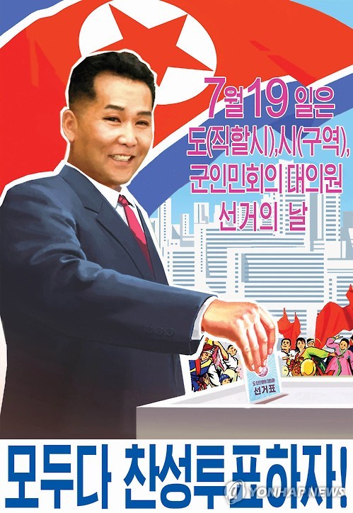 | △ 북한, 대의원선거 선전화 공개 (평양 조선중앙통신=연합뉴스) 북한이 오는 19일 전국 도(직할시)·시(구역)·군 인민회의 대의원선거를 앞두고 선전화를 내놨다고 조선중앙통신이 10일 보도했다. 2015.7.10 photo@yna.co.kr |