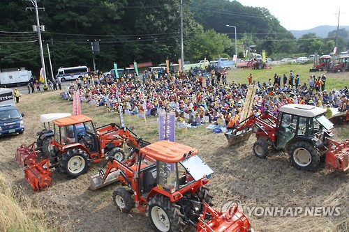| △ 이틀째 집회 "화장장 유치 인센티브 약속지켜라" (울산=연합뉴스) 장영은 기자 = 울산시 울주군 삼동면민들이 5일 삼동면 화장장 하늘공원 진입로 옆 공터에서 이틀째 항의집회를 열고 있다. 이들 주민은 "울산시는 2012년 삼동면민들이 자율 유치한 화장장이 완공되면 개통해주기로 한 도로개설 약속을 지켜라"고 촉구했다.2015.7.5 young@yna.co.kr |
