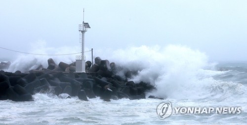 | △ (서귀포=연합뉴스) 변지철 기자 = 12일 오전 제주 해상이 북상하는 제9호 태풍 찬홈의 간접 영향권에 접어들어 서귀포시 법환포구에 높은 파도가 일고 있다 2015.7.10 bjc@yna.co.kr |