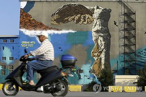 | △ 사진은 아테네 인근 피레우스항의 건물 벽에 그려진 '사모드라케의 날개달린 승리 여신상' 그림 옆으로 스쿠터 한 대가 지나는 모습. (AP=연합뉴스DB) |