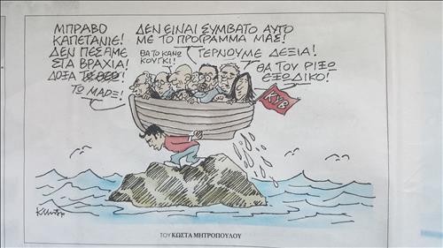 치프라스 총리가 등에 맨 쪽배에 탄 시리자의 제 세력 대표 가운데 한 명은 "선장(치프라스 총리), 우리는 절대 무너지지 않을 것이다. 우리에겐 (칼) 마르크스의 가호가 있다"며 치프라스를 옹호한다.