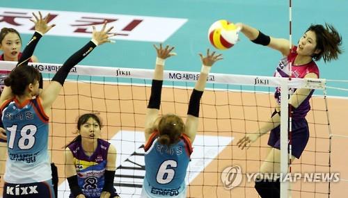 | △ (청주=연합뉴스) 이승민 기자 = 12일 청주 실내체육관에서 열린 2015 KOVO컵 프로배구대회 흥국생명 핑크스파이더스와 GS칼텍스 서울Kixx의 경기. 흥국생명 이재영(오른쪽)이 GS칼텍스 배유나(왼쪽)와 이나영(오른쪽)의 블로킹 사이로 스파이크를 날리고 있다. 2015.7.12 vodcast@yna.co.kr |