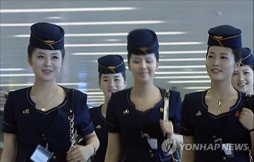 | △ 북한, 평양국제공항 신청사 준공식 (서울=연합뉴스) 북한이 기존 청사의 6배에 달하는 평양 순안국제공항 제2청사 준공식을 1일 열고 본격적인 운영에 들어갔다. 사진은 준공식 영상에 등장한 북한 스튜어디스들. 2015.7.1 nkphoto@yna.co.kr |
