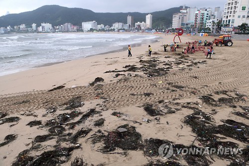 | △ 해수욕장에 태풍이 남긴 흔적 (부산=연합뉴스) 조정호 기자 = 제9호 태풍 '찬홈'이 지나간 13일 부산시 해운대구 송정해수욕장 백사장에서 미화원들이 거센 파도에 밀려온 6t 가량의 해초를 수거하고 있다. 2015.7.13 ccho@yna.co.kr |