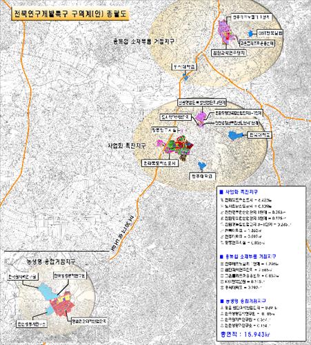 전주·완주·정읍 일대에 15.9㎢ 규모로 조성되는 전북 연구개발 특구는 여러 연구기관이 입주해있는 정읍·완주지역을 연구 거점으로, 전주 및 혁신도시는 사업화 촉진 기능을 할 수 있도록 역할을 분담했다.
