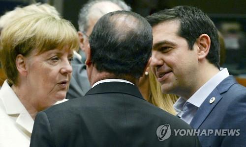 | △ (브뤼셀 AP=연합뉴스) 앙겔라 메르켈 독일 총리(좌)와 알렉시스 치프라스 그리스 총리(우)가 프랑수아 올랑드 프랑스 대통령을 가운데 두고 유로존 정상회의에서 얘기를 나누고 있다. |