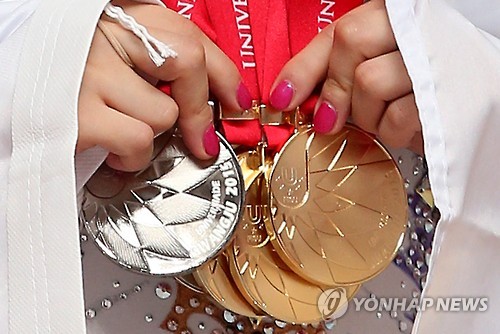 | △ <U대회> '금3 은2' (광주=연합뉴스) 한종찬 기자 = 13일 광주여대 유니버시아드체육관에서 열린 2015 광주하계유니버시아드대회 체조 여자 리본 시상식에서 대한민국 손연재가 금메달 3개, 은메달 2개를 만지고 있다. 손연재는 지난 12일 치른 개인종합결선에서 금메달을, 이날 열린 후프, 볼 부문에서 금메달을 차지해 금메달 3개를 목에 걸었다. 곤봉, 리본 부문에서는 은메달을 획득했다. 2015.7.13 saba@yna.co.kr |