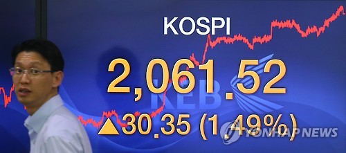 | △ 코스피 2,060선 다시 돌파 (서울=연합뉴스) 김도훈 기자 = 코스피가 전 거래일보다 30.35포인트(1.49%) 오른 2,061.52으로 장을 마감한 13일 오후 서울 을지로 외환은행 본점 딜링룸에서 한 딜러가 종가가 띄워진 스크린 앞을 지나고 있다. superdoo82@yna.co.kr |