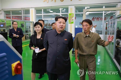 | △ 락랑위생용품공장 시찰하며 설명 듣는 김정은 (서울=연합뉴스) 김정은 북한 국방위원회 제1위원장이 락랑위생용품공장을 현지 지도했다고 노동신문이 14일 보도했다. 사진은 공장을 둘러보며 설명을 듣고 있는 김정은 제1위원장의 모습. 2015.7.14 nkphoto@yna.co.kr |