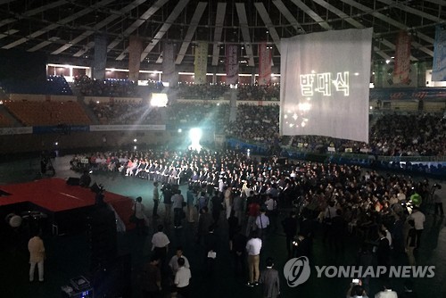 (수원=연합뉴스) 최종호 기자 = '군공항 이전 수원 시민협의회'가 14일 오후 경기도 수원시 수원체육관에서 발대식을 갖고 본격적인 활동에 들어갔다.