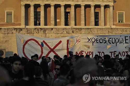 구제금융 합의가 이뤄진 13일(현지시간) 그리스 아테네 의회 앞에서는 소규모 좌파 정당인 안타르시아 주도로 합의안에 반대하는 시위가 열렸다.