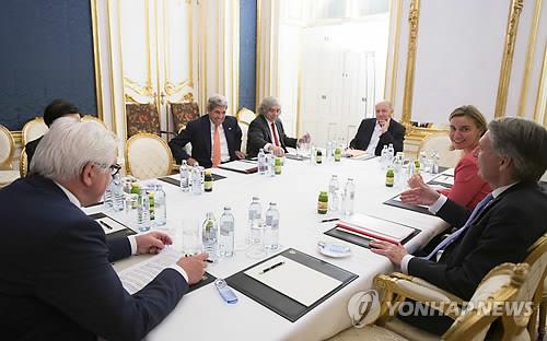 | △ (빈 AP=연합뉴스) 이란과 주요 6개국(유엔 안전보장이사회 5개 상임이사국+독일)이 14일(현지시간) 13년 만에 역사적인 이란 핵협상을 최종 타결했다. 사진은 이날 오스트리아 빈소재 팔레 코부르크 호텔 회담장 모습으로 프랑크-발터 슈타인마이어(왼쪽 첫번째) 독일 외무좡관, 존 케리(" 2번째) 미국 국무장관 및 페데리카 모게리니(오른쪽 2번째) 유럽연합(EU) 외교안보 고위대표 등이 보인다. |