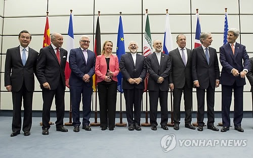 | △ 이란 核협상 주역들 (빈 AP=연합뉴스) 이란과 주요 6개국(유엔 안전보장이사회 5개 상임이사국+독일), 유럽연합(EU)이 역사적인 이란 핵협상을 최종 타결했다고 14일(현지시간) 공식 발표했다. bulls@yna.co.kr |