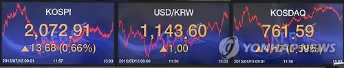 (서울=연합뉴스) 장하나 기자 = 코스피가 15일 외국인의 대량 매수세에 힘입어 2,070선을 회복했다.