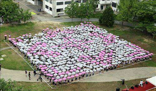 시민 1천명 참석해 흰색·분홍색 우산 이용, 픽셀 애니메이션 형태 주제영상 촬영