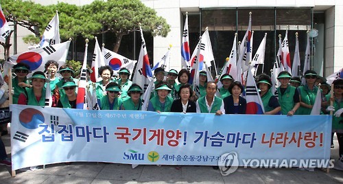 | △ 강남구, '태극기 달기 캠페인' (서울=연합뉴스) 신연희 강남구청장(앞줄 가운데)이 16일 오전 서울 강남구청역에서 새마을운동 회원들과 태극기 달기 캠페인을 한 후 기념촬영하고 있다. (강남구청 제공) |