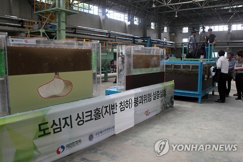 | △ 국립재난안전연구원, 지반침하 붕괴위험 실증실험 (고양=연합뉴스) 김승두 기자 = 국립재난안전연구원이 16일 경기도 고양시의 한국건설기술연구원에서 하수도관과 도로 등 지하구조 모형을 설치해 싱크홀(지반침하) 실증실험을 했다. 2015.7.16 kimsdoo@yna.co.kr |