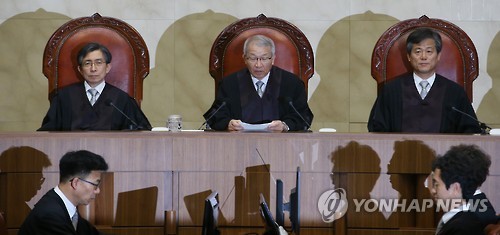 | △ '대선개입' 원세훈 최종심 대법원 전원합의체 (서울=연합뉴스) 임헌정 기자 = 양승태 대법원장을 비롯한 대법관들이 국가정보원 대선개입 혐의로 항소심에서 실형을 받은 원세훈 전 국정원장에 대한 상고심 전원합의체 선고를 위해 16일 오후 서울 서초동 대법원 대법정으로 들어선 뒤 자리에 앉아 있다. |