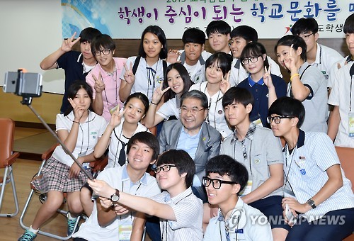 | △ 경기교육감, 학생자치회 대표단과 '셀카 촬영' (수원=연합뉴스) 16일 수원 경기도교육복지종합센터에서 열린 '경기학생자치회, 교육감과 함께하는 토크콘서트'에서 이재정 교육감이 학생들과 대화를 나눈 뒤 스마트폰 셀카봉으로 기념사진을 촬영을 하고 있다. 2015.7.16 <<경기도교육청>> ktkim@yna.co.kr |