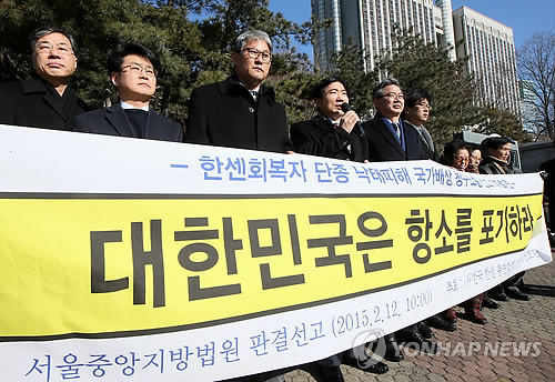 | △ 한국한센총연합회와 한센인권변호단 관계자들이 지난 2월 서초동 서울지방법원 앞에서 한센 회복자들에 대한 강제 '낙태'·'단종'에 따른 국가배상 청구소송에 관한 기자회견을 하고 있다. (연합뉴스 자료사진) |