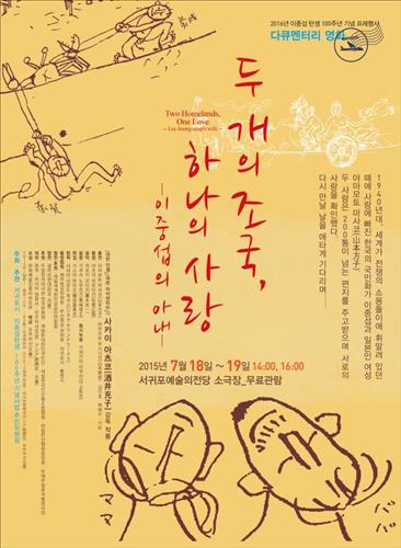 오후 2시와 4시 서귀포 예술의전당에서는 '천재 화가' 이중섭(1916∼1956)과 그의 일본인 아내 이남덕(95) 여사의 사랑 이야기를 담은 다큐멘터리 영화 '두 개의 조국, 하나의 사랑-이중섭의 아내'가 무료로 상영된다.